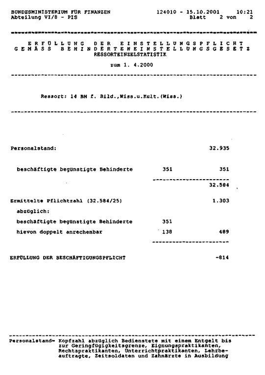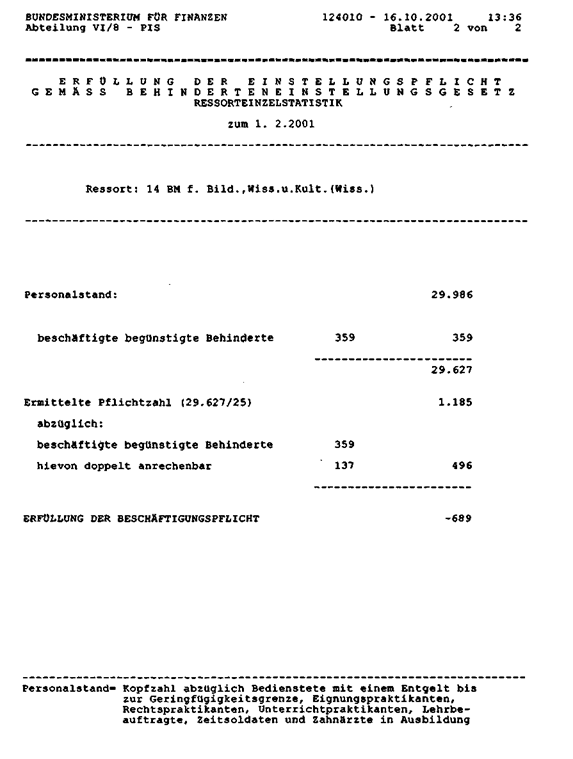 Die Auswertung aus dem PIS “Erfüllung der Einstellungspflicht gemäß Behinderten-einstellungsgesetz", die den anfragenden Abgeordneten als Grundlage gedient haben dürfte, weist insofern eine Diskrepanz auf, als sie ausdrücklich erklärt: “Personalstand = Kopfzahl abzüglich Bedienstete mit einem Entgelt bis zur Geringfügigkeitsgrenze, Eignungspraktikanten, Rechtpraktikanten, Unterrichtspraktikanten, Lehrbeauftragte, Zeitsoldaten und Zahnärzte in Ausbildung". Die vom PIS ausgeworfenen Zahlen ziehen aber diese Personengruppen nicht ab, sondern zählen sie mit. Dies betrifft die oben unter Punkt a, b, c, h und i genannten Personengruppen.