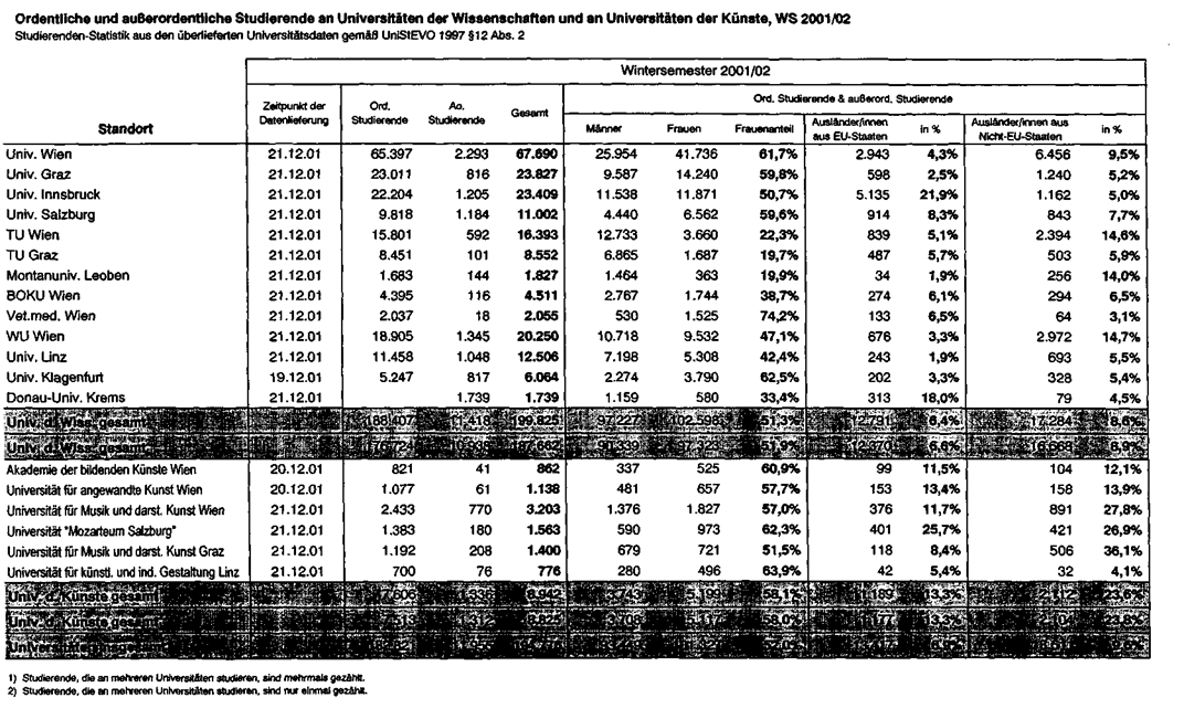 und an Universitäten der Künste, WS 2001/02" (Beilage 1)