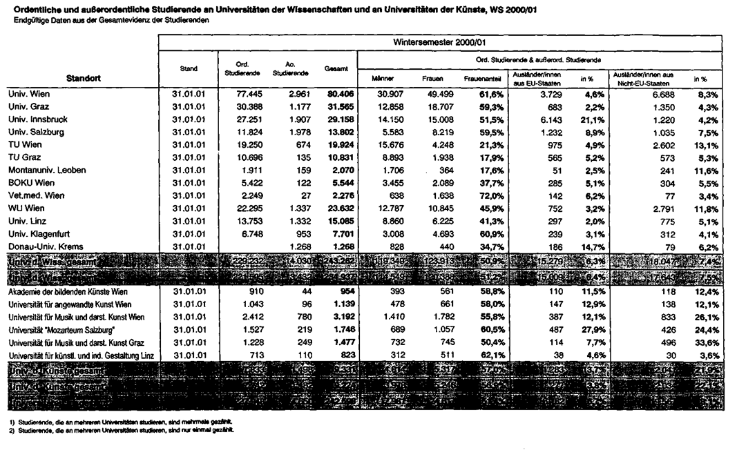 und an Universitäten der Künste, WS 2000/01" (Beilage 2) enthält