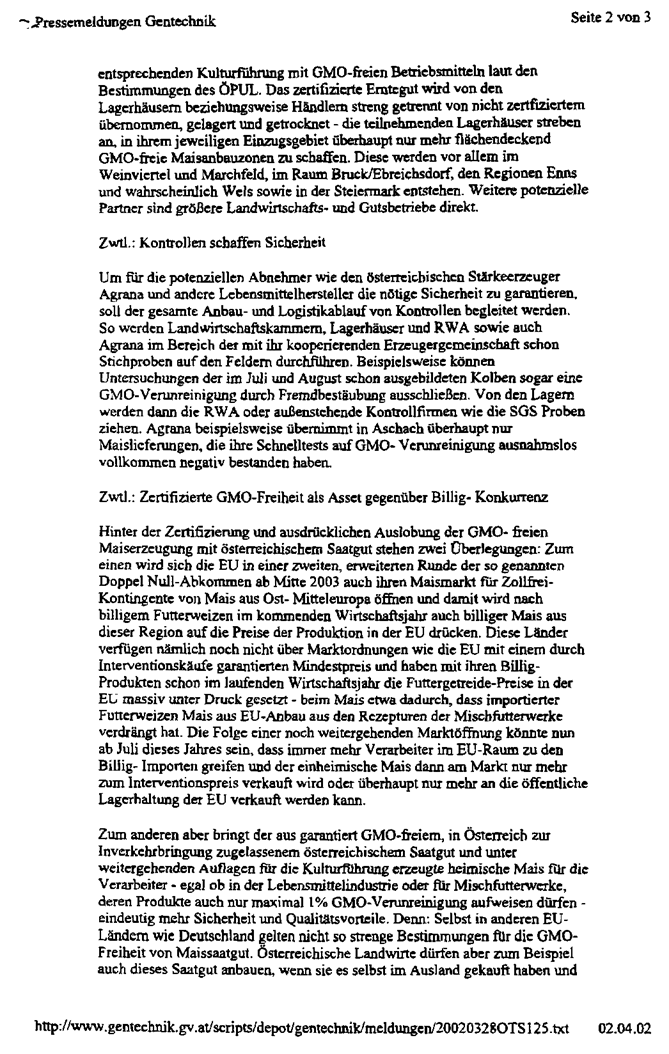 Erzeugung stellt die Einrichtung von “gentechnikfreien" Zonen in der