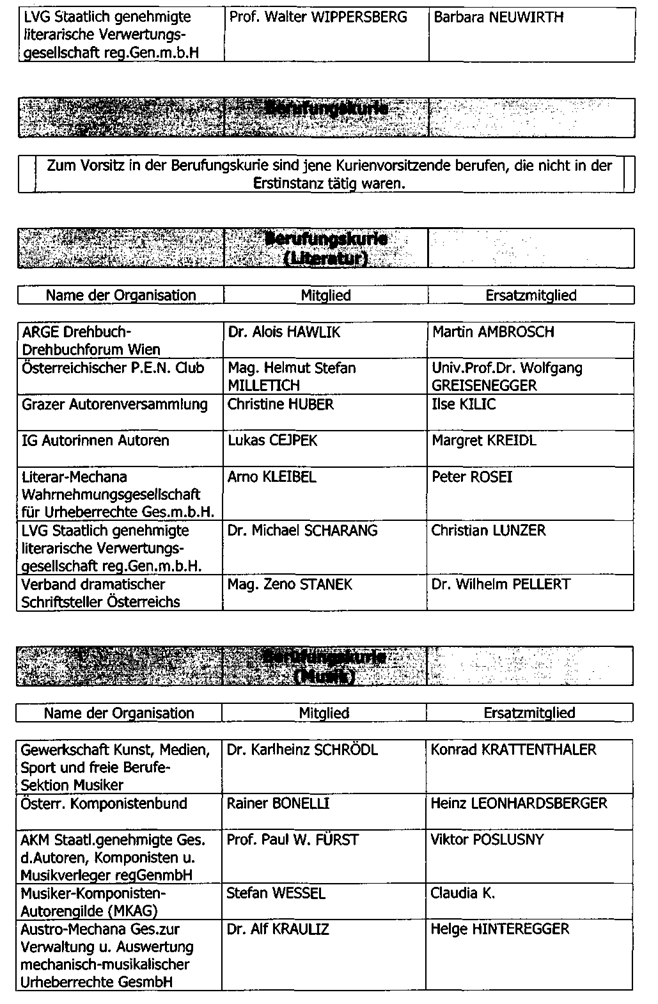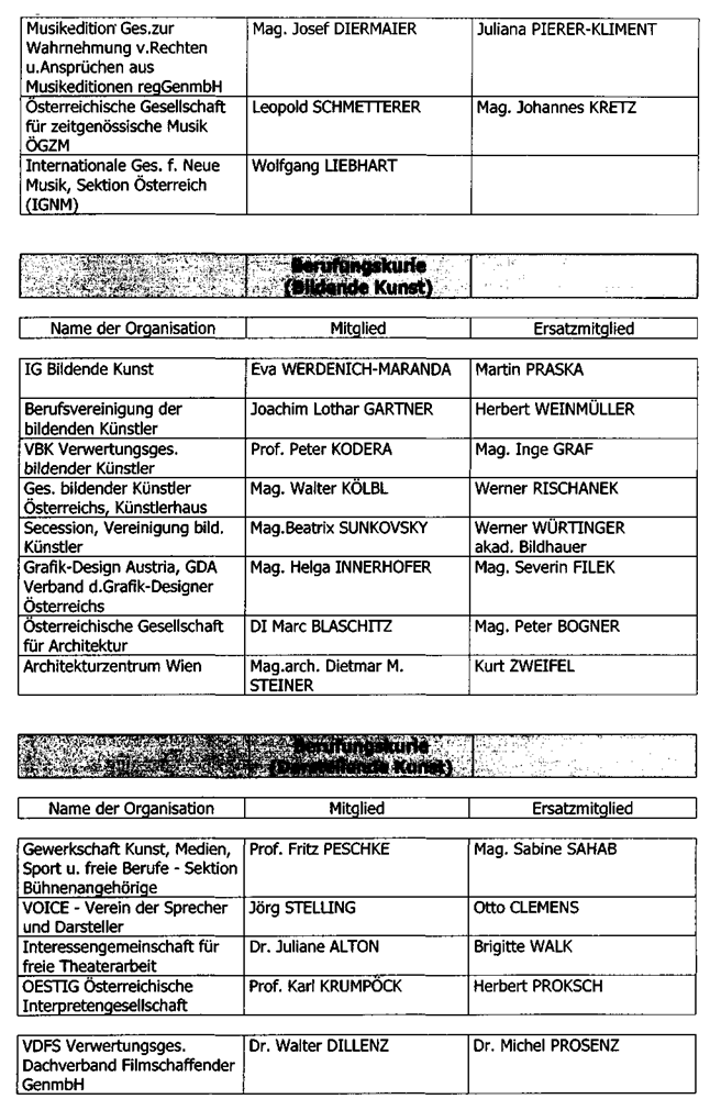 dende Kunst jeweils ein Mal sowie die Berufungskurie für Musik drei Mal