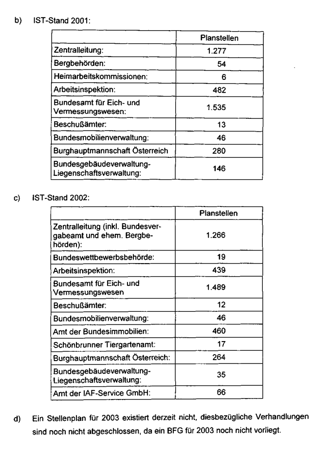 Ausgliederungen / Privatisierungen für 2002 bzw. 2003 in Aussicht