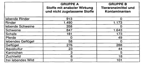 Im Kalenderjahr 1998 wurde folgende Anzahl von Lebendtier - und Fleischproben