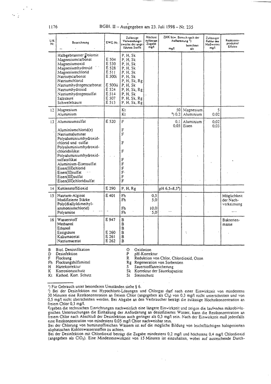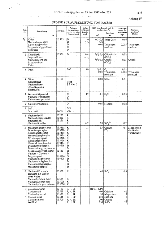brauch, BGBl. II Nr.235/1998, sind für die Aufbereitung von Wasser die im Anhang IV ge -