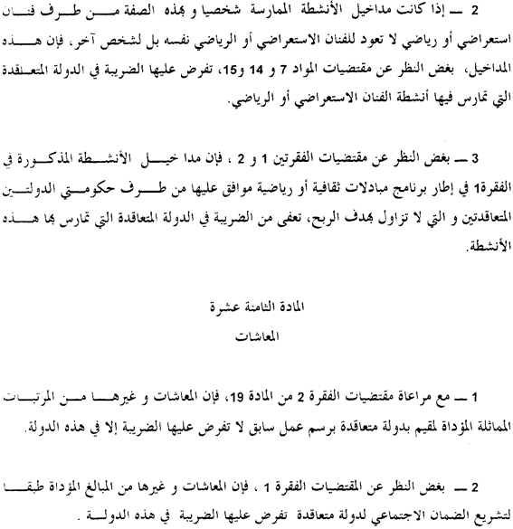 3. Nonobstant les dispositions des paragraphes 1 et 2, les revenus d’activités mentionnées au paragraphe 1 dans le cadre d’un programme d’échanges culturels ou sportifs approuvé par les Gouvernements des deux Etats contractants et qui ne sont pas exercées dans un but lucratif, sont exonérées d’impôts dans l’Etat contractant où les activités sont exercées.