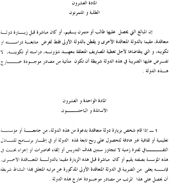 1. Une personne qui visite un Etat contractant sur invitation de cet Etat, d’une université ou d’une institution d’éducation ou culturelle sans but lucratif de cet Etat ou dans le cadre d’un programme d’échange culturel pour une période n’éxcédant pas deux années dans le but d’enseigner, de donner des conférences ou de mener des travaux de recherche pour cette institution ou qui est ou qui était immédiatement avant cette visite résident de l’autre Etat contractant sera exemptée de l’impôt dans ledit premier Etat contractant sur sa rémunération pour telle activité à condition que cette rémunération lui provienne en dehors de cet Etat.