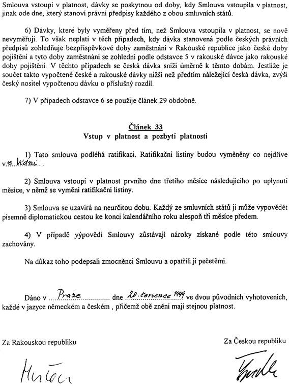 Diese Artikel enthalten die üblichen Übergangs- und Schlußbestimmungen (siehe zB Art. 34 sowie 36 und 37 des Abkommens mit Kroatien und Art. 36 sowie Art. 38 und 39 des Abkommens mit Slowenien), wobei durch die ergänzende Regelung des Abs. 3 des Art. 32 der Übernahme tschechischer Beschäftigungs- und Versicherungszeiten im Rahmen des Auslandsrenten-Übernahmegesetzes (ARÜG) und der entsprechenden Bestimmungen des § 116 Abs. 6 GSVG bzw. § 107 Abs. 6 BSVG Rechnung getragen wurde. Durch diese Regelung wird insbesondere für die in Österreich wohnenden Pensionsbezieher, in deren Pension entsprechende Zeiten zu berücksichtigen sind, eine Feststellung einer tschechischen Leistung für diese Zeiten vermieden, die zu einer entsprechenden Kürzung der österreichischen Leistung führen würde, sodaß sich – außer einem enormen Verwaltungsaufwand – für den Berechtigten keine Verbesserung aus dem Abkommen ergeben würde.