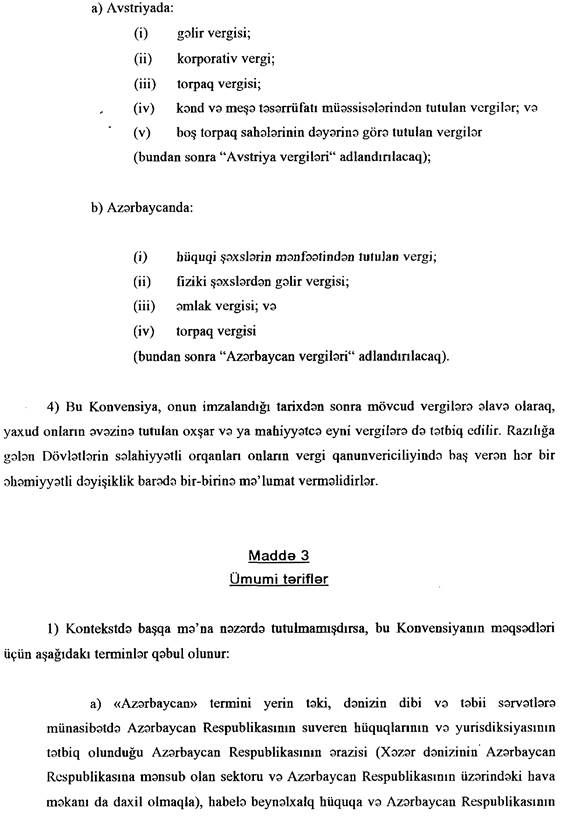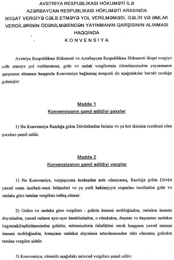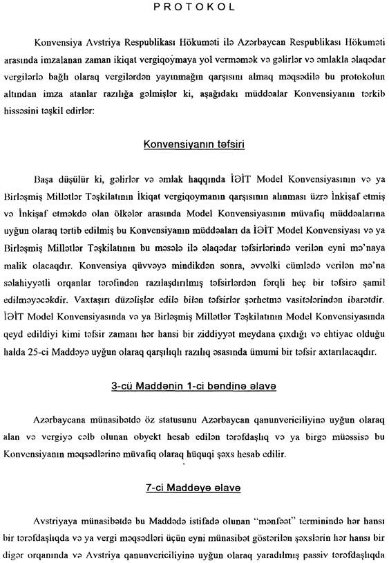At the moment of signing the Convention between the Government of the Republic of Austria and the Government of the Republic of Azerbaijan for the avoidance of double taxation and the prevention of fiscal evasion with respect to taxes on income and on capital, the undersigned have agreed that the following provisions shall form an integral part of the Convention: