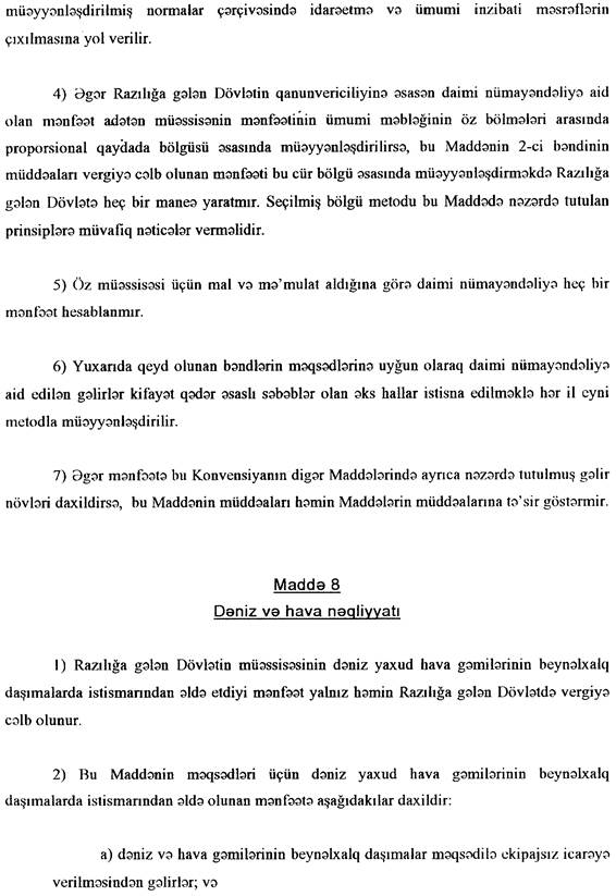 Dieser Artikel sieht abweichend von der OECD-Regelung vor, dass Gewinne aus dem Betrieb von Schiffen und Luftfahrzeugen im internationalen Verkehr nur in dem Staat besteuert werden dürfen, in dem das Unternehmen ansässig ist. Die Zuteilungsregel des Art. 8 gilt auch für Einkünfte aus Containerleasing.