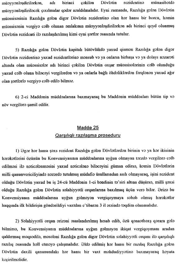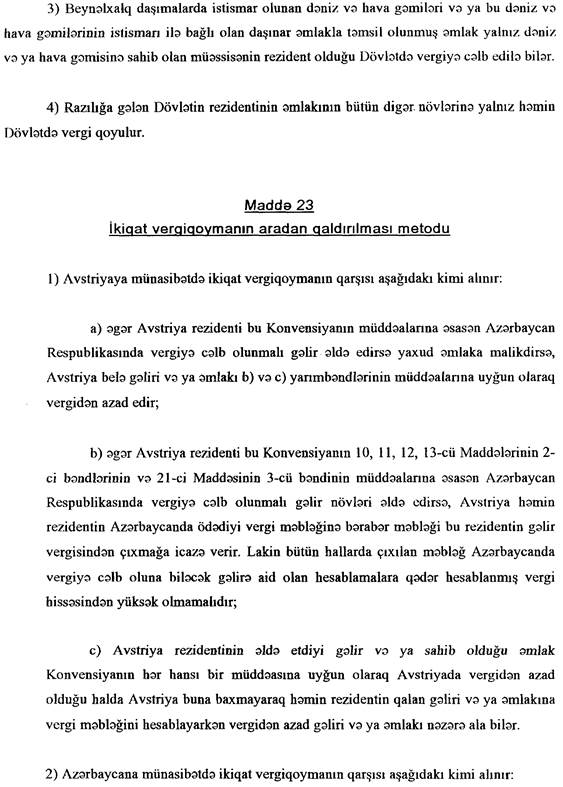 In diesem Artikel werden die Methoden festgelegt, nach denen die Doppelbesteuerung vermieden wird: Österreich wendet hiebei auf OECD-Grundlage die Befreiungsmethode unter Progressionsvorbehalt an. Nur im Falle von Quellenbesteuerungsrechten für Dividenden, Zinsen und Lizenzgebühren, so wie bei Veräußerung von Gesellschaftsanteilen (Immobiliengesellschaften) und sonstigen Einkünften (Art. 21 Abs. 3) wird die Doppelbesteuerung nach der Anrechnungsmethode vermieden. Aserbaidschan wendet generell die Anrechnungsmethode an.