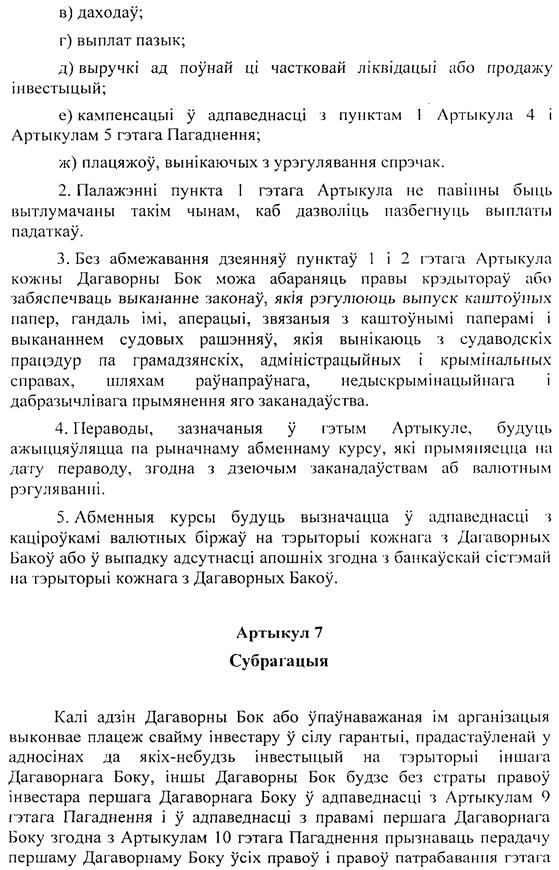 Da Investitionen seitens öffentlicher Stellen des Staates, dem der Investor angehört, vielfach mit Garantien ausgestattet werden, sieht dieser Artikel vor, dass im Falle des Eintrittes des Garantiegebers in die Rechte des Garantienehmers dieser Eintritt von der anderen Vertragspartei anerkannt wird.