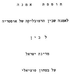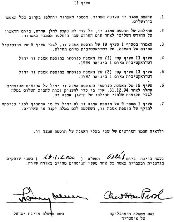 GESCHEHEN zu Wien, am 13. Jänner 2000, der dem 6. Shwat 5760 entspricht, in zwei Urschriften in deutscher und hebräischer Sprache, wobei beide Texte in gleicher Weise authentisch sind.