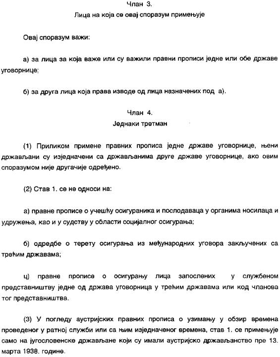 Hinsichtlich des persönlichen Geltungsbereiches des Abkommens ist darauf hinzuweisen, dass das bisherige Abkommen auf die Staatsangehörigen aller früheren sechs Teilrepubliken des früheren Jugoslawien anzuwenden war und daher eine Einschränkung des neuen Abkommens nur auf die beiderseitigen Staatsangehörigen eine wesentliche Einschränkung bedeutet hätte. Das Abkommen umfasst daher wie der Großteil der anderen von Österreich geschlossenen Abkommen über soziale Sicherheit ohne Rücksicht auf ihre Staatsangehörigkeit alle Personen, die nach den Rechtsvorschriften eines der beiden Vertragsstaaten versichert sind oder waren, sowie ihre Angehörigen und Hinterbliebenen.
