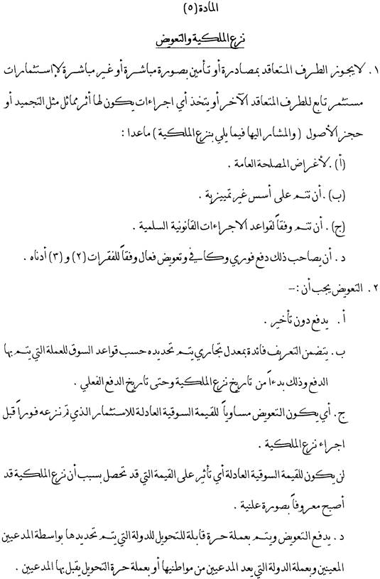 Dieser Artikel befasst sich mit der Frage der Entschädigung im Falle einer Enteignung und ist somit als einer der wichtigsten Artikel des Abkommens anzusehen.