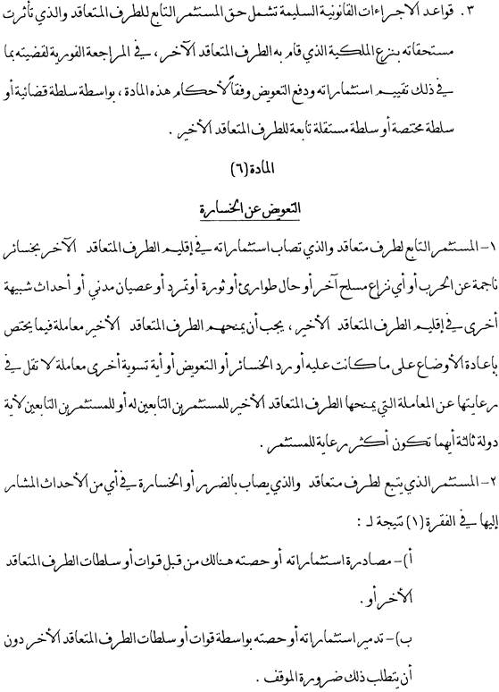 Dieser Artikel behandelt die Frage der Entschädigung eines Investors für den Fall von kriegerischen Auseinandersetzungen oder ähnlichen Ereignissen auf dem Hoheitsgebiet einer Vertragspartei und sieht auch für solche Fälle die Inländergleichbehandlung bzw. Meistbegünstigung vor.