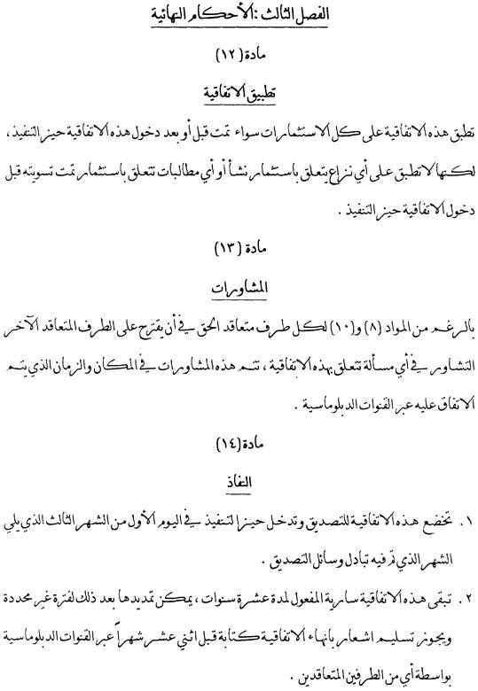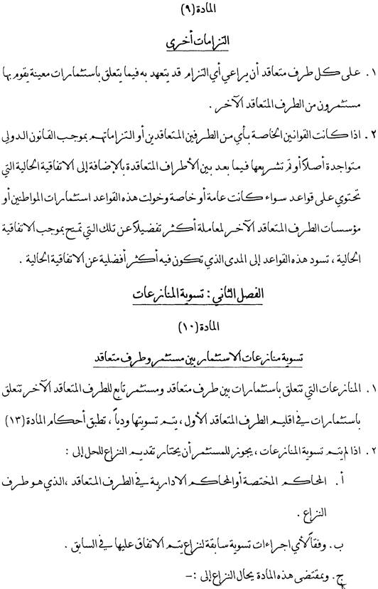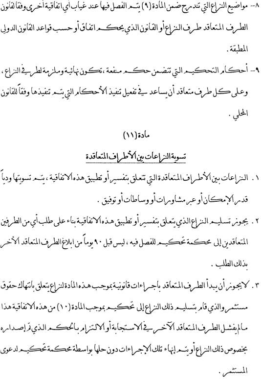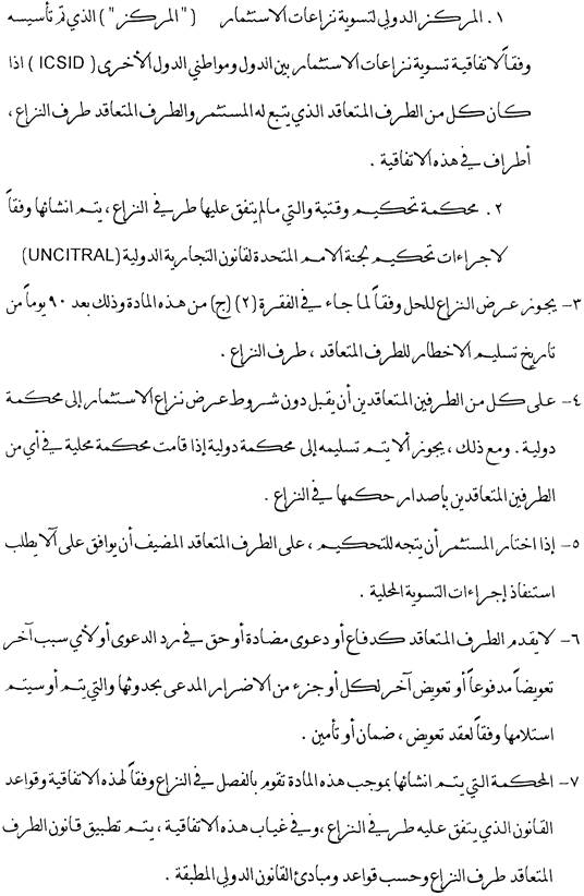 Absatz 2 legt fest, dass bei Streitigkeiten zwischen einem Investor und einem Vertragsstaat im Sinne des Abkommens zunächst eine Beilegung durch Verhandlungen oder Konsultationen versucht werden soll. Streitigkeiten aus einer Investition zwischen einer Vertragspartei und einem Investor der anderen Vertragspartei, die auf dem Verhandlungswege nicht beigelegt werden können, können vom Investor dem Internationalen Zentrum für die Beilegung von Investitionsstreitigkeiten im Sinne der Washingtoner Konvention über die Beilegung von Investitionsstreitigkeiten vom 18. März 1965 oder einem auf Grund der UNCITRAL-Regeln errichteten Ad-hoc-Schiedsgericht unterbreitet werden.