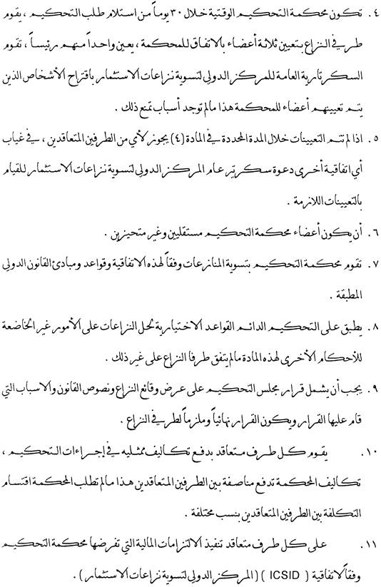 Bei Streitigkeiten zwischen einem Investor und einem Vertragsstaat sieht das Abkommen ein Schiedsverfahren vor. Streitigkeiten aus einer Investition zwischen einer Vertragspartei und einem Investor der anderen Vertragspartei, die auf dem Verhandlungswege nicht beigelegt werden können, können vom Investor dem Internationalen Zentrum für die Beilegung von Investitionsstreitigkeiten im Sinne der Washingtoner Konvention über die Beilegung von Investitionsstreitigkeiten vom 18. März 1965 oder einem auf Grund der UNCITRAL-Regeln errichteten Ad-hoc-Schiedsgericht unterbreitet werden.