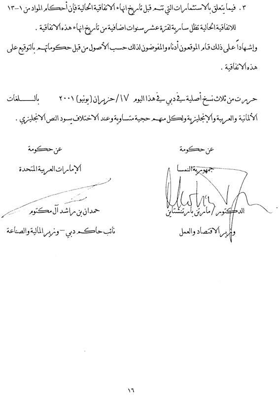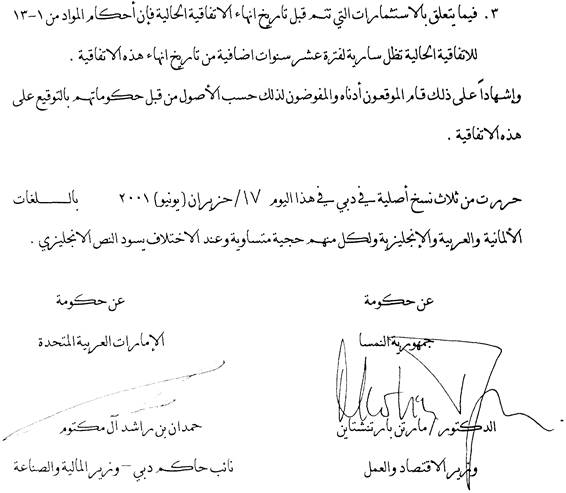 DONE in duplicate at Dubai, on June 17th 2001, in the German, Arabic and English languages, all texts being equally authentic. In case of difference of interpretation the English text shall prevail.