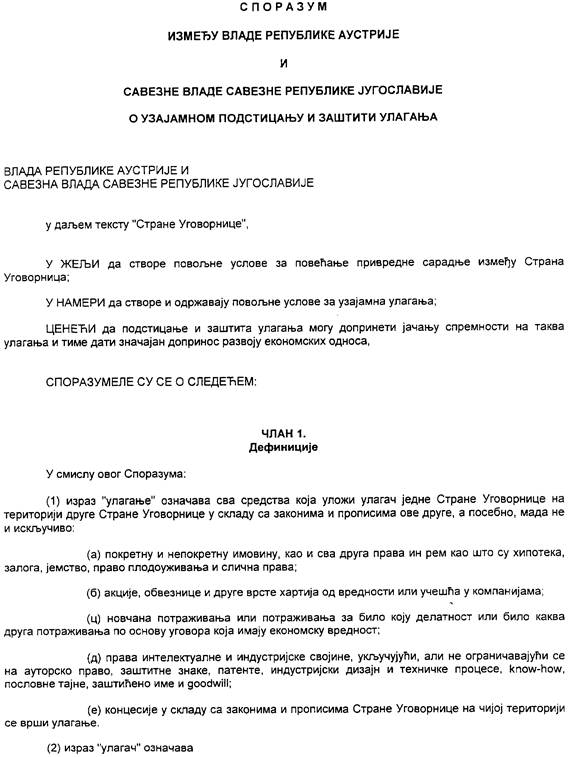 zwischen der Regierung der Republik Österreich und der Bundesregierung der Bundesrepublik Jugoslawien über die gegenseitige Förderung und den Schutz von Investitionen