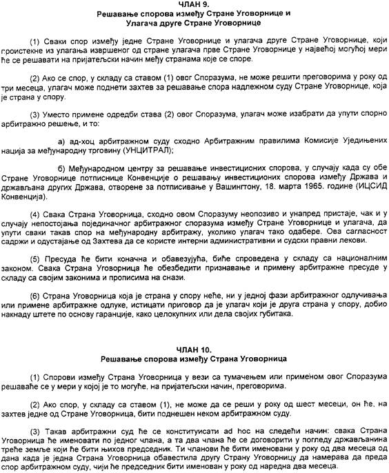 Bei Streitigkeiten zwischen einem Investor und einem Vertragsstaat sieht das Abkommen ein Schiedsverfahren vor. Streitigkeiten aus einer Investition zwischen einer Vertragspartei und einem Investor der anderen Vertragspartei, die auf dem Verhandlungswege nicht innerhalb einer Frist von drei Monaten beigelegt werden können, können vom Investor dem zuständigen inländischen Gericht, einem auf Grund der UNCITRAL-Regeln errichteten Ad-hoc-Schiedsgericht oder dem Internationalen Zentrum für die Beilegung von Investitionsstreitigkeiten im Sinne der Washingtoner Konvention über die Beilegung von Investitionsstreitigkeiten vom 18. März 1965 unterbreitet werden.