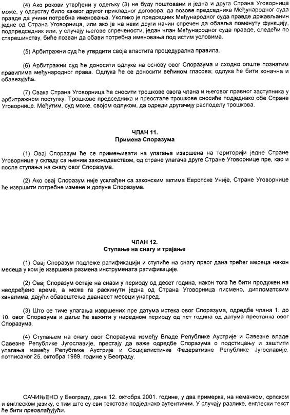 DONE in Belgrad, on 12 October 2001, in duplicate, in the German, Serbian and English languages, all texts being equally authentic. In case of divergence, the English text shall prevail.