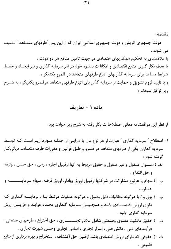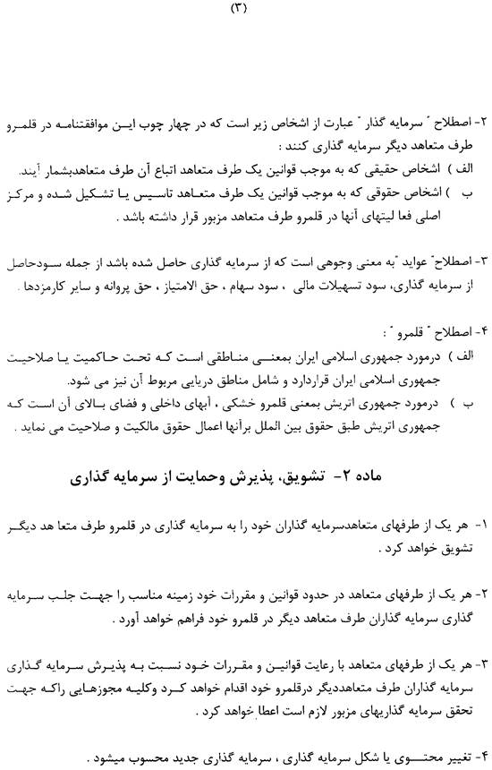 Dieses Abkommen gilt für Investitionen, die von der zuständigen Stelle der als Gastland fungierenden Vertragspartei vor oder nach dem In-Kraft-Treten dieses Abkommens genehmigt wurden oder werden. Die zuständige Stelle in der Islamischen Republik Iran ist die Organisation für Investitionen, Wirtschaftliche und Technische Hilfe des Iran (OIETAI). Dieses Abkommen gilt jedoch nicht für Forderungen, die vor seinem In-Kraft-Treten erhoben oder beglichen wurden.