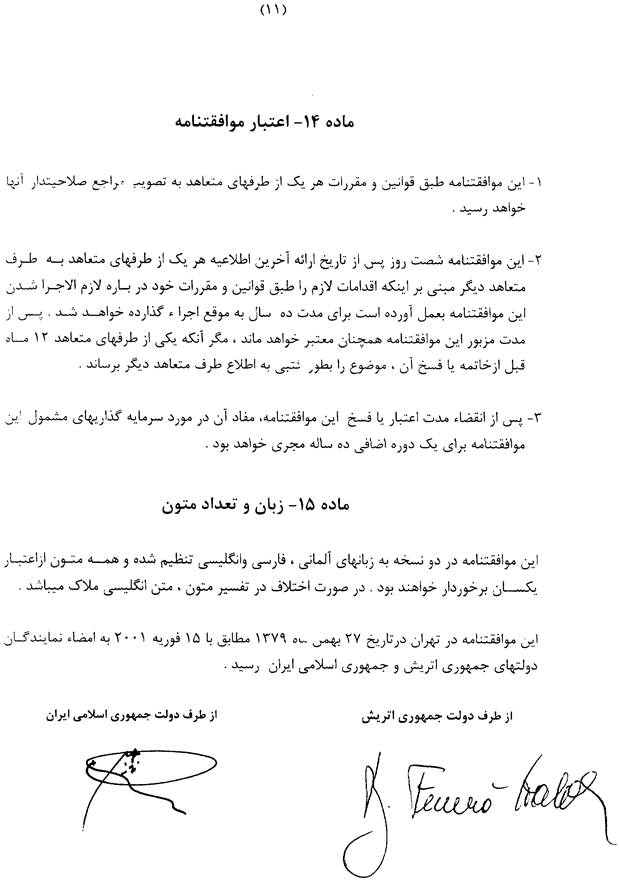 Signed in Teheran on 15 February 2001 corresponding to 27 Bahman 1379 by representatives of the Government of the Republic of Austria and the Government of the Islamic Republic of Iran.