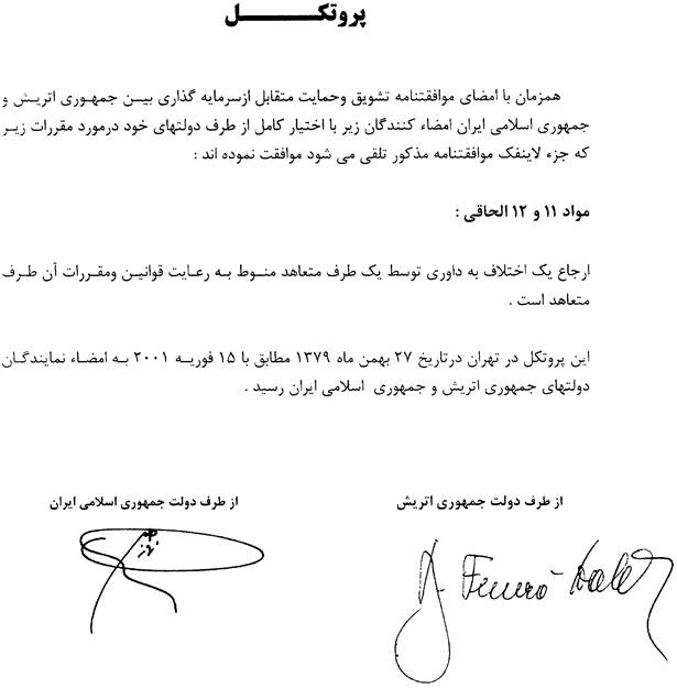 On signing the Agreement on Reciprocal Promotion and Protection of Investments between the Government of the Republic of Austria and the Government of the Islamic Republic of Iran, the undersigned plenipotentiaries have agreed on the following provisions, which shall be regarded as an integral part of the said Agreement: