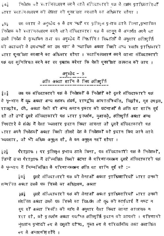 behandelt die Frage der Entschädigung eines Investors für den Fall von kriegerischen Auseinandersetzungen oder ähnlichen Ereignissen auf dem Hoheitsgebiet einer Vertragspartei und sieht auch für solche Fälle die Inländergleichbehandlung bzw. Meistbegünstigung vor.