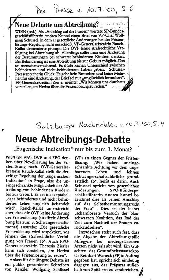Schwangerschaftsabbruch gegeben (siehe Salzburger Nachrichten vom 10. Juli 2000, Seite 4;