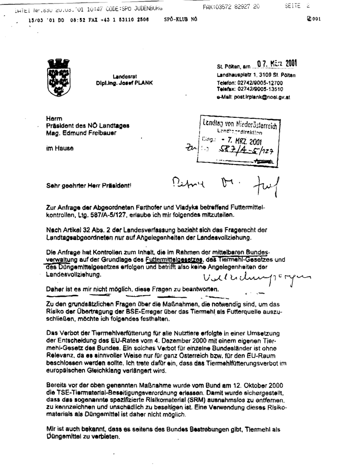 dazugehörige Antwort des befragten Landesrates Dipl. Ing. Josef Plank Plank (Beilage dieser