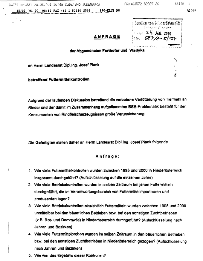 Farthofer und Vladyka betreffend Futtermittelkontrollen (Ltg.587/A - 5/127)durch den
