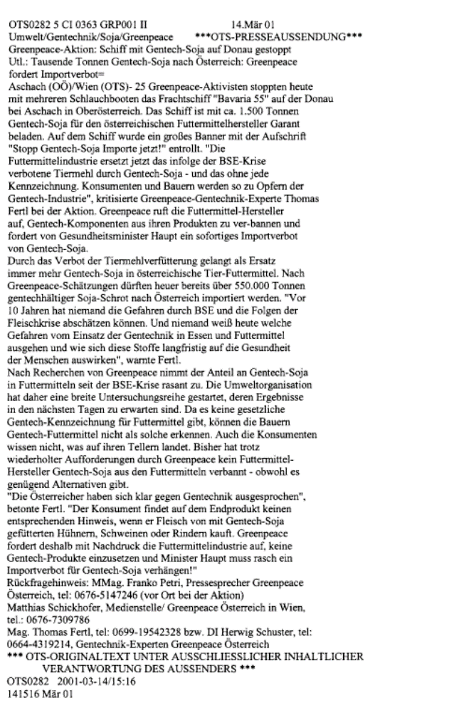 Österreich“ bei Aschach ein Frachtschiff mit genetisch verändertem Soja gestoppt. Diese