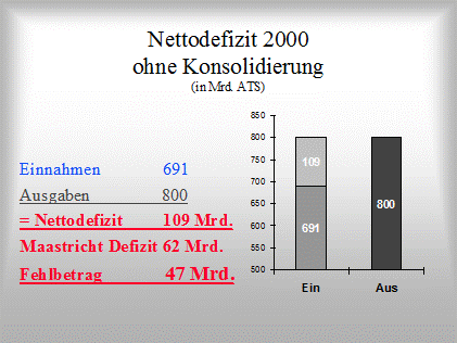In der Ministerratssitzung vom 19. Oktober 1999 – schon gehört? – hat der damalige Finanzminister Edlinger über die Budgetperspektiven für das Jahr 2000 gesprochen. Er hat dabei klar und eindeutig gesagt, welche Notwendigkeiten zu weiteren Einsparungen bestehen. Er hat darauf hingewiesen, dass der Betrag, der nach Abzug des Maastricht-konformen Defizits und nach den entsprechenden Maßnahmen bei den Fonds noch zu bedecken bleibt, in der Größen-ordnung von 25 bis 30 Milliarden Schilling liegt.