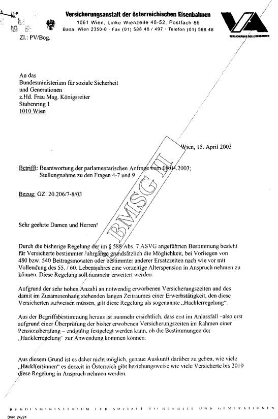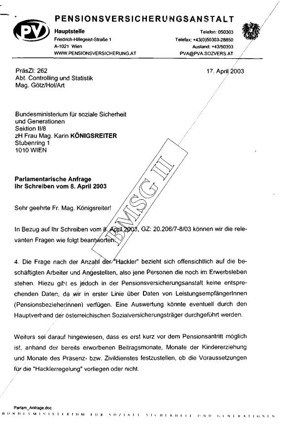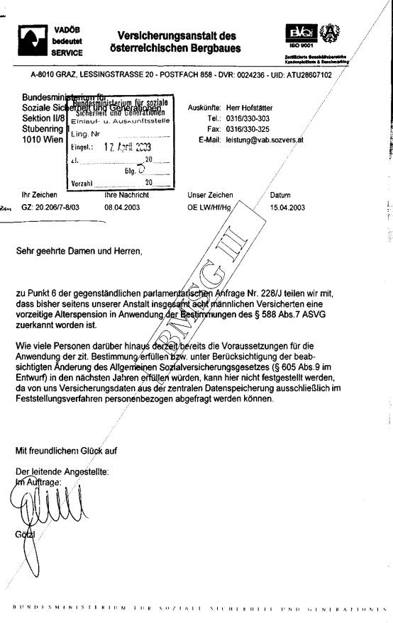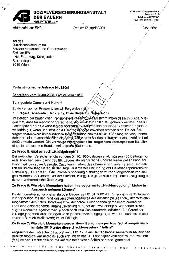 Keck, Schöpf, Krist und Genossen betreffend „Hacklerregelung", Nr. 228/J,