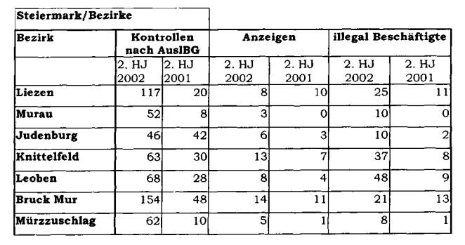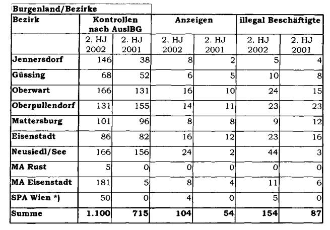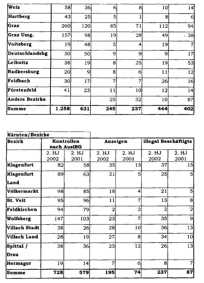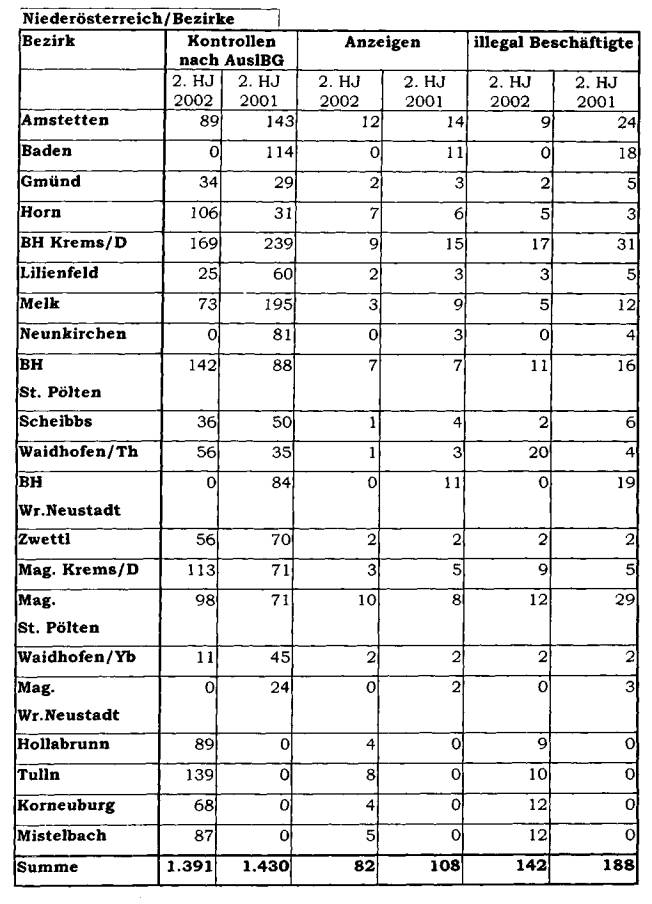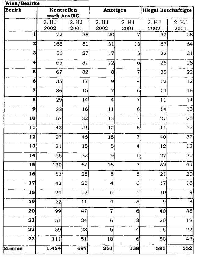 Kontrollen, Anzeigen und festgestellten illegal Beschäftigten auf die Bezirke
