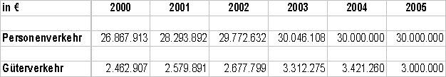 Bezüglich der ÖBB-Investitionen ergeben sich für die einzelnen Jahre seit 2000 folgende Werte (in Mio €), wofür vom BMF Haftungen gemäß §2 BBG 1992 bzw. §47 BBG 2003 übernommen wurden:1)