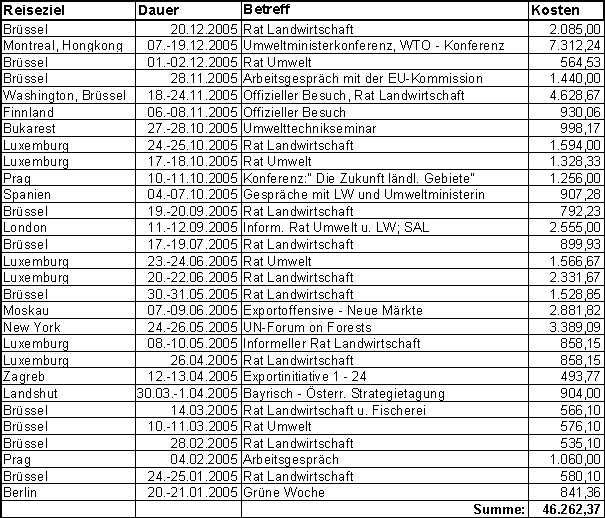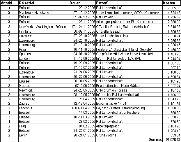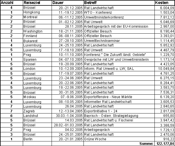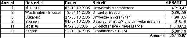 Die Auslandsdienstreisen der Mitarbeiterinnen und Mitarbeiter des Ministerbüros im Jahr 2005 sind unter Angabe der Anzahl der mitreisenden Personen, der Kosten (in €) und des Reisezweckes zusammengefasst: