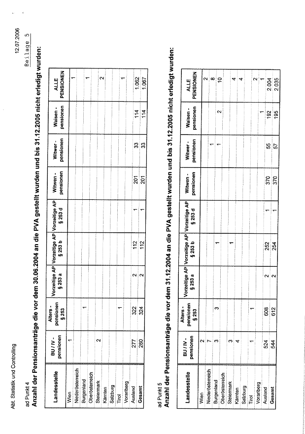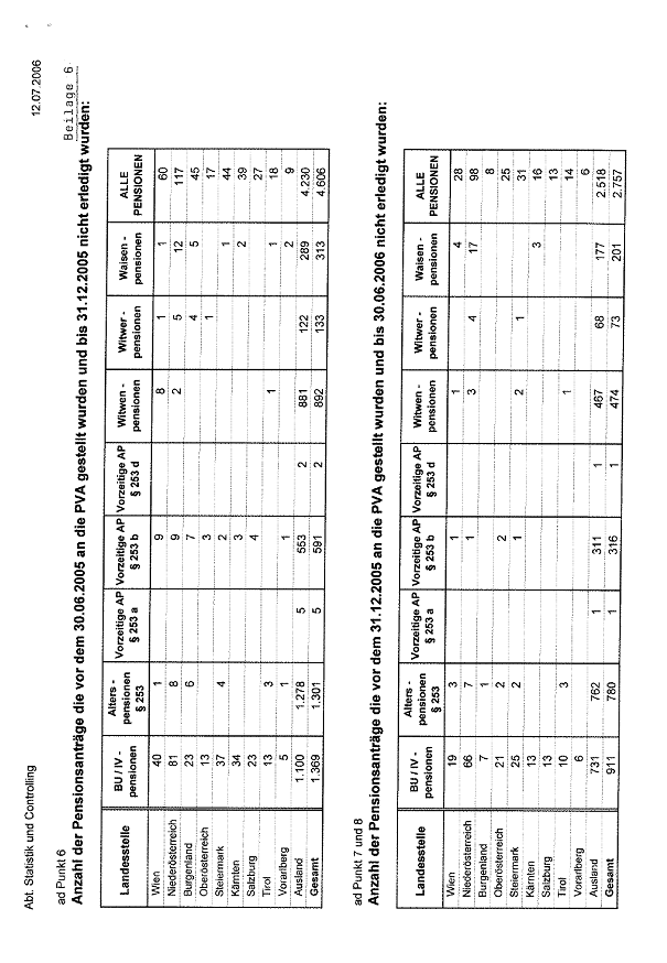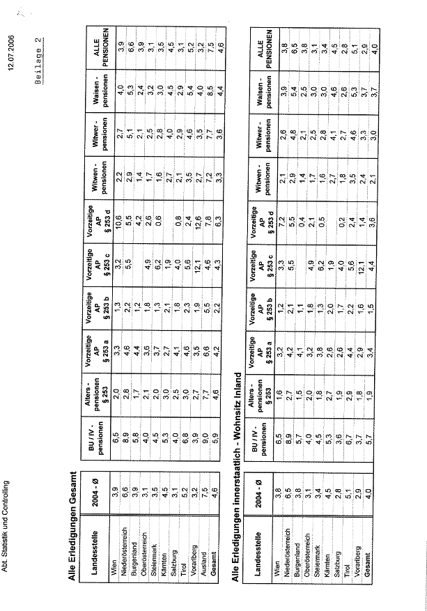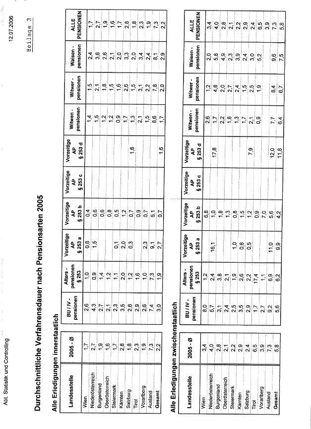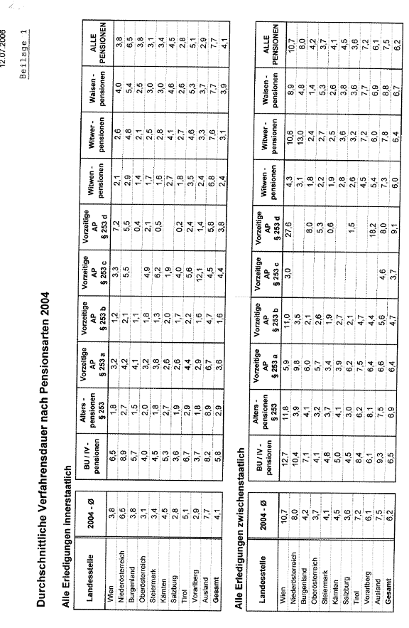 Die entsprechende Erledigungsdauer findet sich in den Beilagen 1- 4, wobei allerdings darauf hinzuweisen ist, dass die Darstellung auch nach Zuordnung zu den neun Landesstellen der Pensionsversicherunganstalt erfolgt ist. Grundsätzlich muss aber angemerkt werden, dass ein Pensionsantrag bereits sechs Monate vor dem möglichen Stichtag gestellt werden kann und somit in der Darstellung aufscheint. Eine Erledigung kann jedoch frühestens mit dem Stichtag erfolgen. Das heißt, dass sich durch diese frühe Antragstellung eine für die Versicherten scheinbar lange Wartezeit ergeben, die aber von Seiten der Pensionsversicherungsanstalt nicht steuerbar ist.