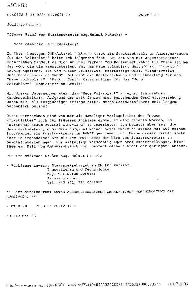 Staatssekretär Kukacka in seinem Offenen Brief den Missbrauch als eine