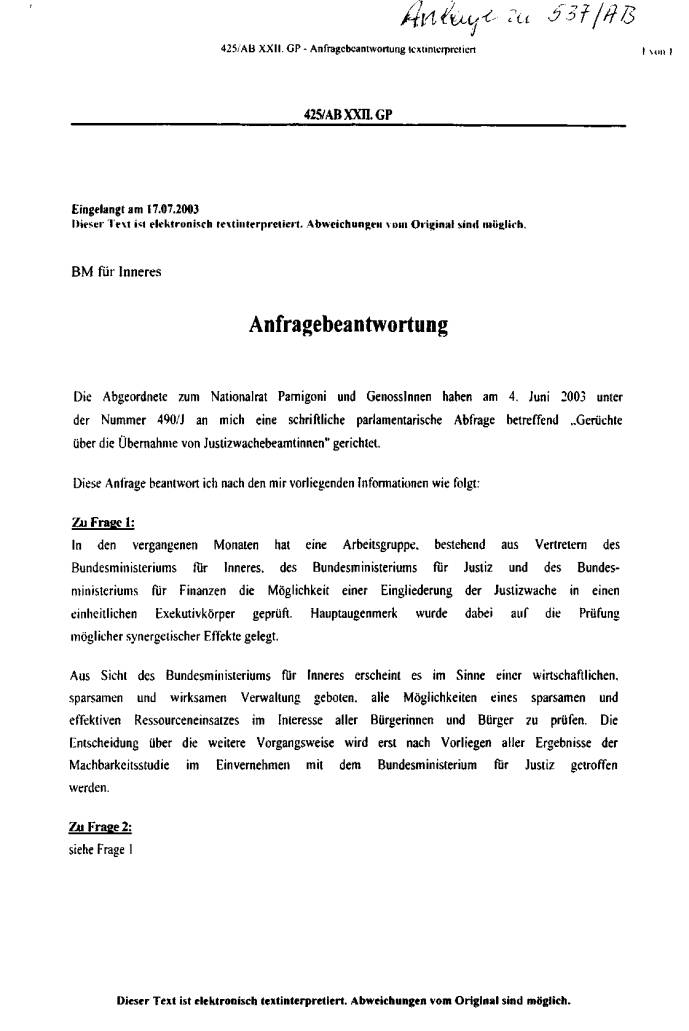 Justizwachebeamtinnen in das BMI" gerichtet.