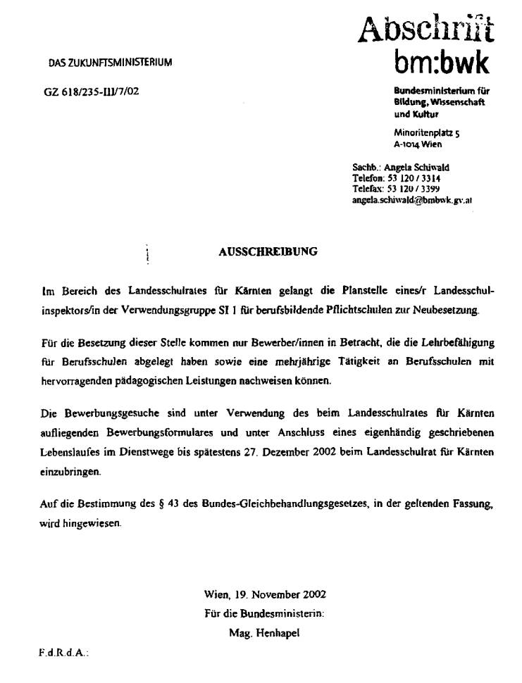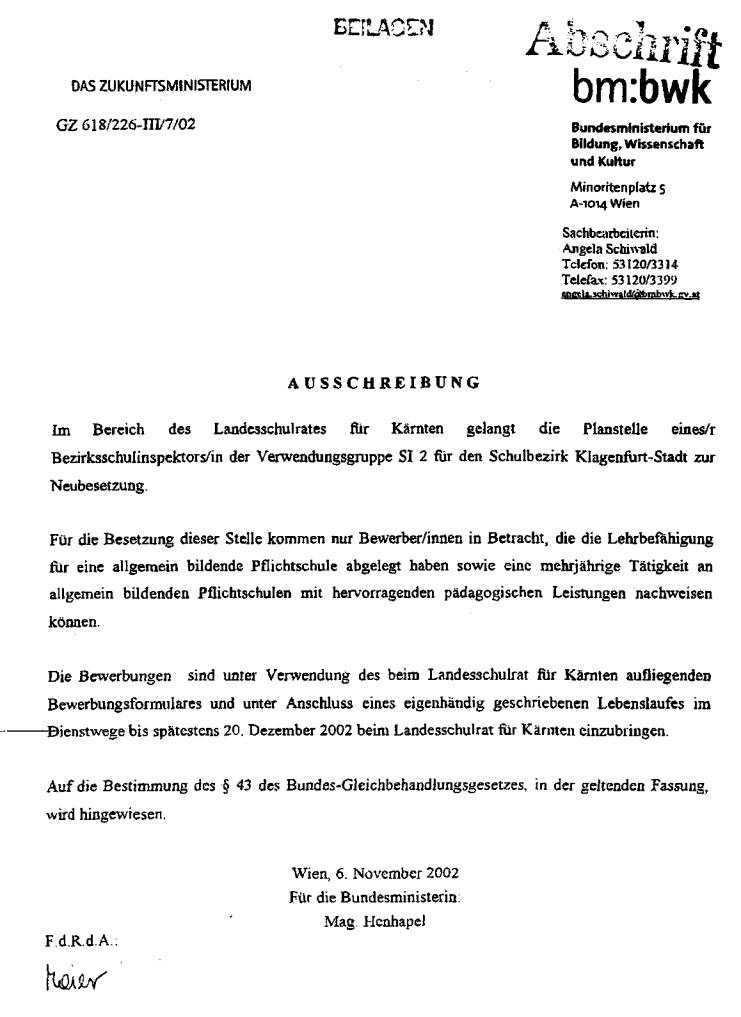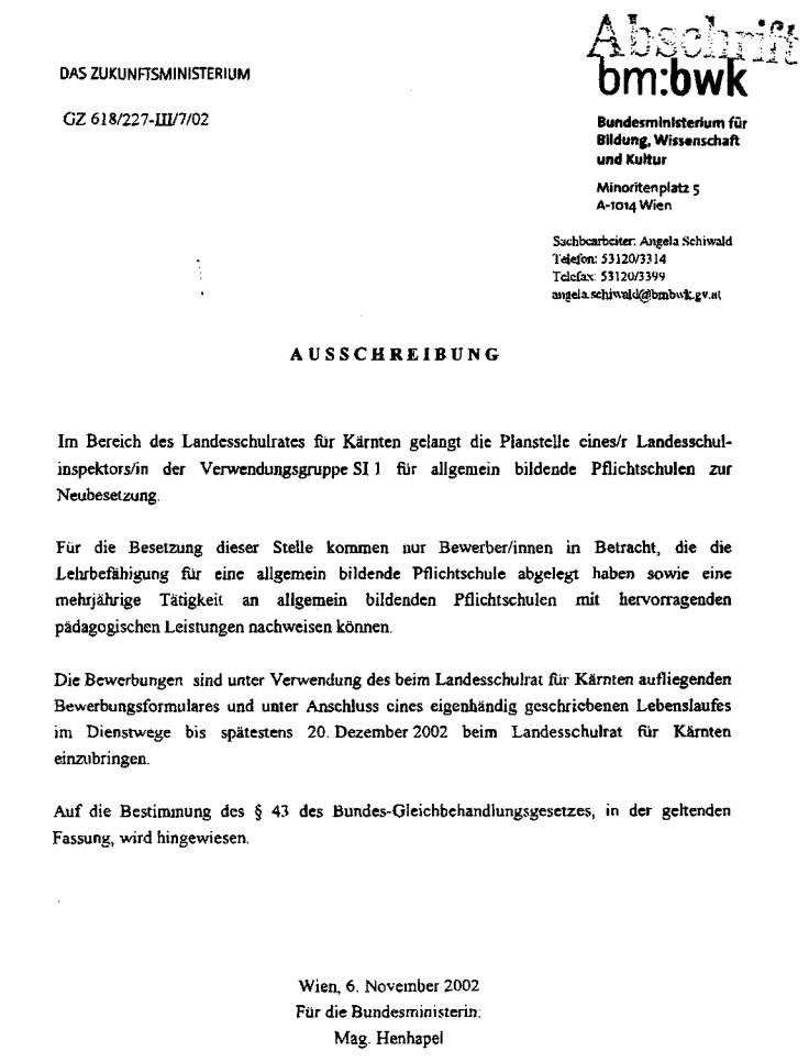 des Landesschulrates. Dies ist auch der Inhalt des Schreibens,