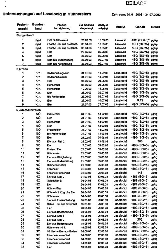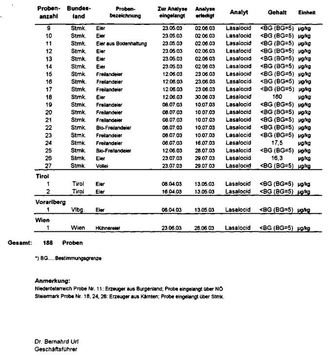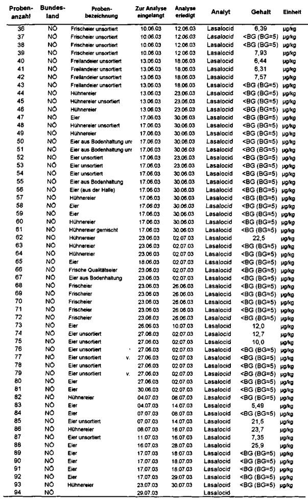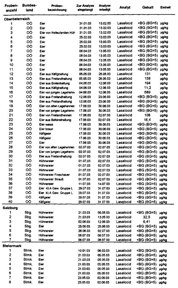 gezogenen Eiproben auf Lasalocid untersucht wurden - , dass folgende Angaben
