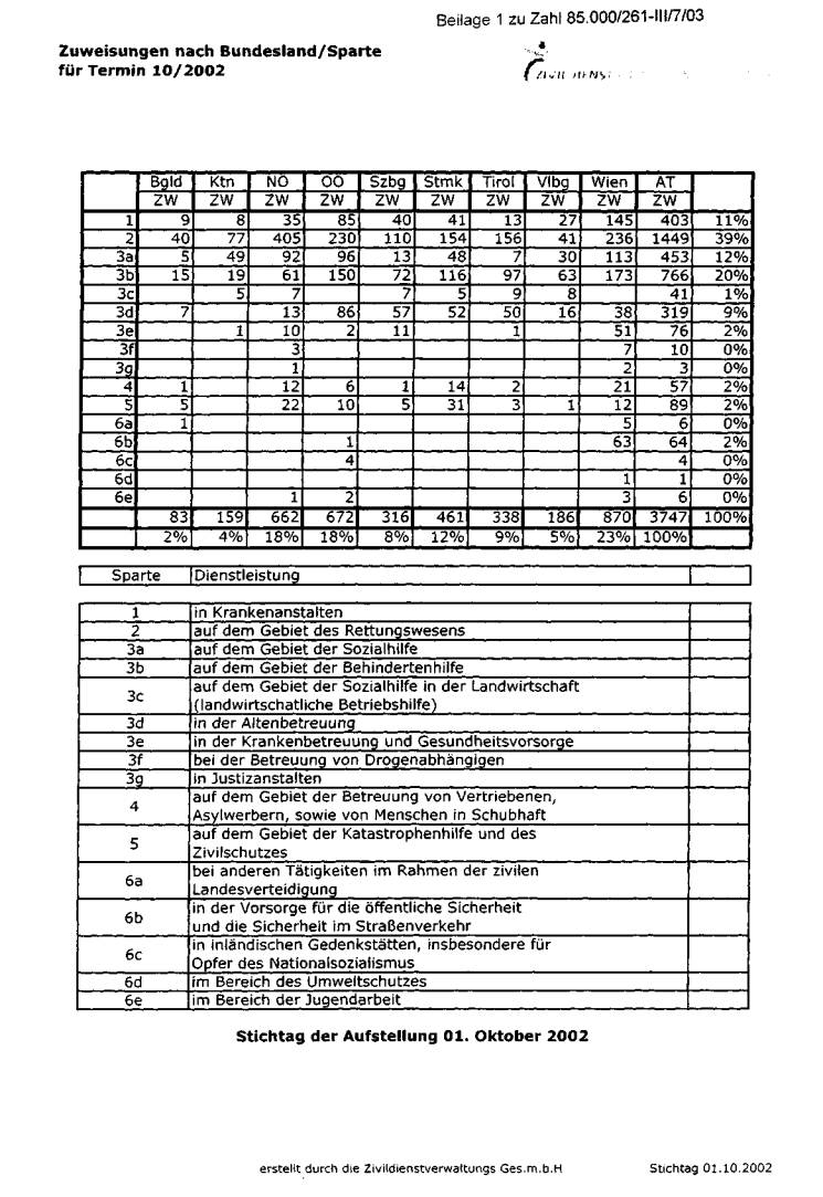 Zum 2. Oktober 2002 waren 3.747 Zivildienstpflichtige zum ordentlichen Zivildienst
