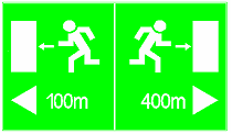 - Fluchtwege durch folgende Fluchtwegorientierungskennzeichen in Abständen von höchstens 25 m an den Tunnelwänden in 1,0 m Höhe (Unterkante) über dem Fluchtweg und unter Angabe der Entfernung der beiden jeweils nächstgelegenen Notausgänge:
