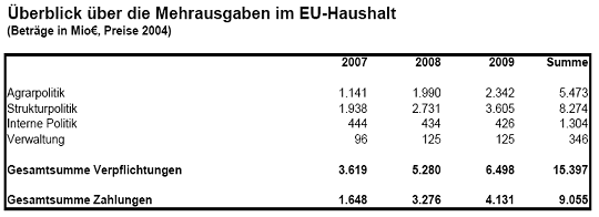 Die unten stehenden Tabellen geben einen Überblick über die Leistungen des EU-Haushaltes für Bulgarien und Rumänien und die hieraus erwachsenden Auswirkungen auf Österreich. Insgesamt stehen für die beiden Länder in den ersten drei Jahren nach Beitritt € 15,397 Mrd. an Verpflichtungen bzw. € 9,055 Mrd. an Zahlungen zur Verfügung. Die dargestellten Beträge stellen Obergrenzen dar. Inwieweit diese Beträge ausgeschöpft werden, kann zum derzeitigen Zeitpunkt nicht vorhergesagt werden. Bei einer vollen Ausschöpfung der zur Verfügung stehenden Mittel für Bulgarien und Rumänien kann für Österreich eine Mehrbelastung bei der Finanzierung des EU-Haushaltes in den ersten drei Jahren von bis zu rund € 200 Mio. entstehen.