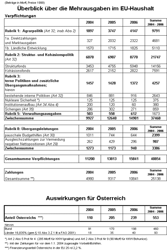 4.1. EU Leistung der EU an die neuen Mitgliedstaaten; Mehrausgaben für die Haushaltsperiode 2004 bis 2006 |