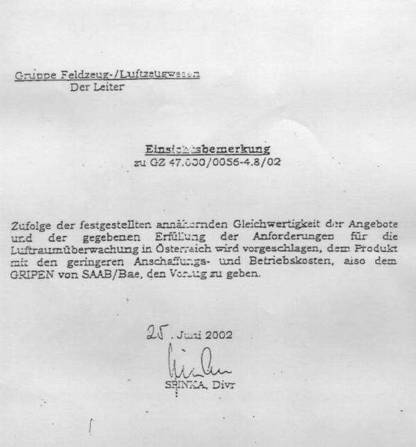Nach Abschluss der Arbeit der Bewertungskommission wanderte der Akt auf dem vorgesehenen Dienstweg zu den direkten Vorgesetzten und wiederum deren Vorgesetzten. Als erster versah Divr. Wolfgang Spinka, Leiter der Gruppe Feldzeugwesen/Luftzeugwesen, den Akt mit einer Einsichtsbemerkung, in der er „zufolge der festgestellten annähernden Gleichwertigkeit der Angebote“ empfahl, „dem Produkt mit den geringeren Anschaffungs- und Betriebskosten, also dem Gripen von SAAB/BAE, den Vorzug zu geben“.
