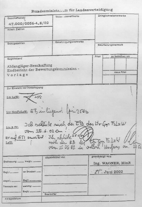Spinkas Vorgesetzter, der Leiter der Beschaffungssektion General Dr. Peter Corrieri, ergänzte den Akt mit dem Vermerk: „Ich schließe mich der EB des LtrGrpFzLzW vom 25.6.02 an!“