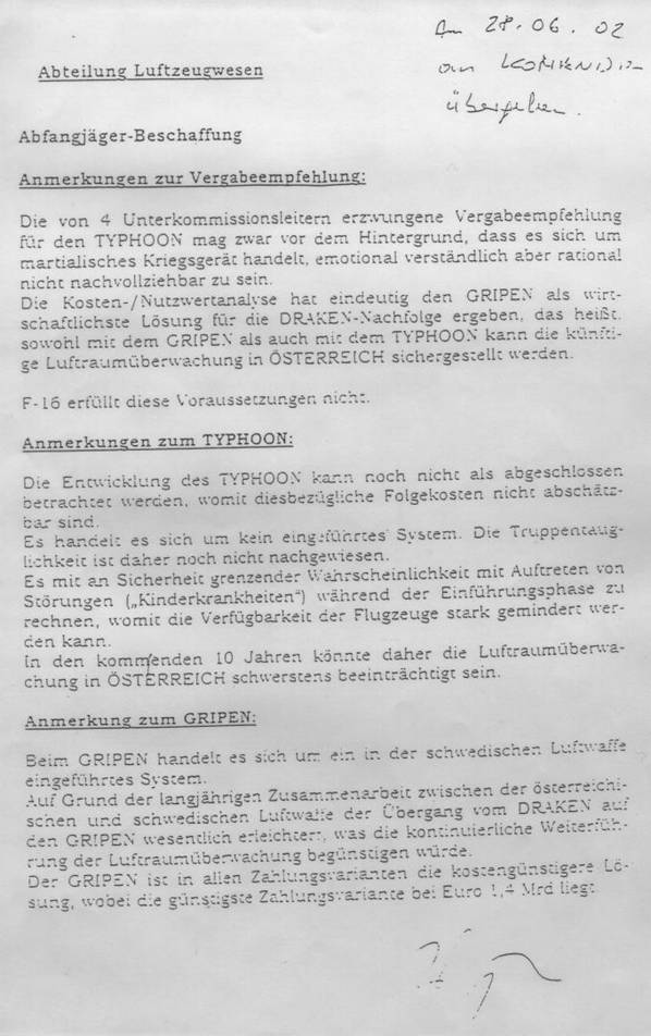 General Corrieri hat auf einer Einsichtsbemerkung zur Vergabeempfehlung der Vergabekommission vermerkt: „Ich schließe mich der EB des Ltr Grp FzLzW vom 25.6.02 an.“ In der Einsichtsbemerkung des damaligen Divr. Spinka, Leiter der Gruppe Feldzeug-/Luftzeugwesen, wird festgestellt, dass Eurofighter und Gripen annähernd gleichwertig seien, und daher dem Produkt mit den geringeren Anschaffungs- und Betriebskosten, also dem Gripen, der Vorzug zu geben sei: